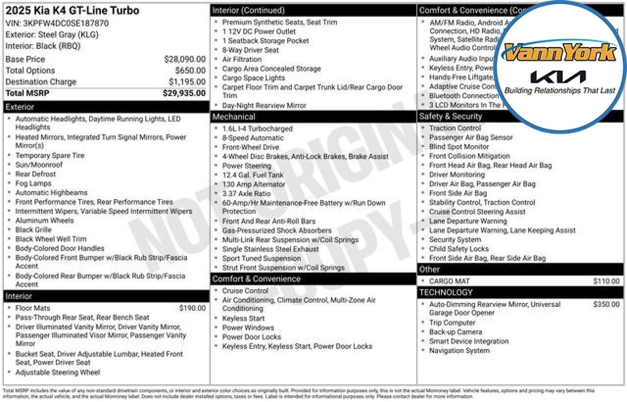 Discover the exhilarating 2025 Kia K4 GT-Line Turbo - a masterful blend of style, performance, and cutting-edge technology. This captivating sedan is poised to elevate your driving experience to new heights. Equipped with a robust 1.6L I4 Turbo engine and an 8-Speed Automatic transmission, the K4 GT-Line Turbo delivers an exceptional balance of power and efficiency, offering an EPA-estimated 26 city/36 highway MPG. Indulge in the convenience of the - Navigation System, AM/FM radio: SiriusXM, and the stunning harman/kardon Speakers that bring your music to life. The 12.3 Touchscreen Audio Display keeps you connected and entertained, while features like Automatic temperature control, Power driver seat, and Remote keyless entry ensure your comfort and convenience. - Frameless EC Mirror w/Homelink - Sport steering wheel - Telescoping steering wheel - Heated front seats - Split folding rear seat - SynTex Seat Trim - Wheels: 18 x 8.0J Black Alloy The K4 GT-Line Turbo's striking exterior is enhanced by the bold presence of 18 Black Alloy wheels, Auto High-beam Headlights, and Fully automatic headlights. Step inside and experience the refined cabin, complete with a Power moonroof, Apple CarPlay & Android Auto, and a host of advanced safety features, including ABS brakes, Dual front side impact airbags, and Electronic Stability Control. Meticulously crafted to deliver an exceptional driving experience, the 2025 Kia K4 GT-Line Turbo is a testament to Kia's commitment to innovation and excellence. Discover the perfect balance of style, performance, and technology that will elevate your daily commute and weekend adventures alike. We invite you to experience the 2025 Kia K4 GT-Line Turbo firsthand. Visit our showroom and let our knowledgeable team guide you through all the features and capabilities that make this sedan a true standout in its class. We're confident that once you take it for a test drive, you'll be captivated by its dynamic personality and eager to make it your own. Price includes: $1000 - KFA Dealer Choice Program: $1000 discount and 5.25% APR for 36 months. $30.08 per $1000 financed. Available to well qualified buyers who finance through Kia Finance America. 506. Exp. 03/31/2026