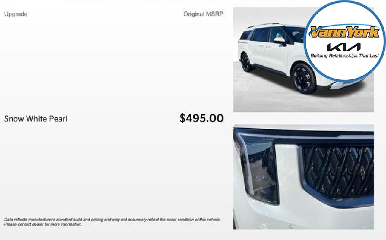 The 2026 Kia Carnival EX is a remarkable family-focused minivan that combines exceptional versatility, advanced technology, and a refined driving experience. Boasting a striking White exterior, this Carnival EX offers a spacious and well-appointed cabin that is sure to impress. - Snow White Pearl exterior color - Carpeted floor mats (8-passenger) - Navigation system - AM/FM radio: SiriusXM - Automatic temperature control - Memory seat - Power driver seat - Remote keyless entry - Four-wheel independent suspension - Dual front impact airbags - Emergency communication system - Occupant sensing airbag - Power liftgate - Electronic stability control - Exterior parking camera rear - Auto high-beam headlights - Security system - Heated door mirrors - Power door mirrors - Apple CarPlay & Android Auto - Leather shift knob - Leather steering wheel - Telescoping steering wheel - 3rd-row seats: split-bench - Heated front seats - Reclining 3rd-row seat - Wheels: 7.5J x 19 machine-finished alloy The Carnival EX's impressive V6 engine, paired with an 8-speed automatic transmission and front-wheel drive, delivers a smooth and efficient driving experience, with an EPA-estimated 18 MPG in the city and 26 MPG on the highway. The vehicle's spacious interior and versatile seating configuration make it an ideal choice for growing families, offering ample room for passengers and cargo alike. Kia's commitment to safety is evident in the Carnival EX, which comes equipped with a comprehensive suite of advanced driver-assistance technologies, including a rear-view camera, lane-keeping assist, and forward collision warning. These features work together to provide a confident and secure driving experience, giving you and your loved ones peace of mind on the road. Whether you're embarking on a family road trip or navigating the daily demands of your busy lifestyle, the 2026 Kia Carnival EX is the perfect companion. With its exceptional combination of style, technology, and functionality, this minivan is sure to exceed your expectations and make every journey a pleasure. We invite you to visit our showroom and experience the Carnival EX for yourself. Our knowledgeable sales team is here to answer any questions you may have and help you discover the perfect vehicle to meet your needs. We're confident that once you've had the opportunity to explore the Carnival EX, you'll be eager to make it part of your family. Price includes: $1500 - KFA Dealer Choice Program: $1500 discount and 5.25% APR for 36 months. $30.08 per $1000 financed. Available to well qualified buyers who finance through Kia Finance America. 506. Exp. 03/31/2026